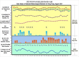 August 2021 was characterized by cloudier than usual weather with localized heavy rain over parts of the New Territories. The mean amount of cloud in the month was 77 percent, 7 percent above the normal of 70 percent. As for monthly rainfall, the monthly rainfall recorded at the Observatory was 350.5 millimetres while over 600 millimetres of rainfall were recorded in parts of the North District of the New Territories.