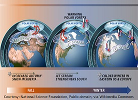A new study shows that increases in extreme winter weather in parts of the US are linked to accelerated warming of the Arctic. The scientists found that heating in the region ultimately disturbed the circular pattern of winds known as the polar vortex. This allowed colder winter weather to flow down to the northern midlatitudes. (Link for the paper)