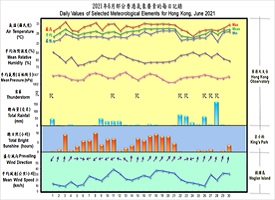 June 2021 was marked by the long awaited rainy weather brought by tropical cyclone Koguma, troughs of low pressure and the active southwesterly airstream. The rain was particularly heavy and persistent on the morning of 28 June and the incessant downpour necessitated the issuance of the first Black Rainstorm Warning this year.