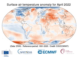 April 2022 was globally around the sixth warmest April since records began. April temperatures over much of Europe were close to average values for 1991-2020. Temperatures were unusually high from north-eastern Africa across the Middle East to central and southern Asia. Pre-monsoon temperatures were extremely high over Pakistan and northern India.