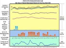 The weather for March 2026 was much warmer than usual in Hong Kong. The monthly total sunshine duration amounted to 165.0 hours, 65 percent above the normal of 100.0 hours. With more sunshine, the monthly mean temperature of 21.5 degrees, monthly mean maximum temperature of 24.5 degrees and monthly mean minimum temperature of 19.6 degrees were 2.0 degrees, 2.6 degrees and 2.0 degrees above their corresponding normals.